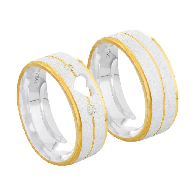 Alianças de Namoro Em Prata 11g 5mm Fosca Coração Filete em Ouro. Apresentamos as nossas lindas alianças de namoro em prata fosca com filetes em ouro e coração vazado. Para o casal que busca alianças detalhadas e diferentes das clássicas alianças de namoro, este é um par ideal. Com filetes em ouro nas extremidades e no centro da aliança, são detalhes que acrescentam elegância para os acessórios. A peça dela ainda contem delicado detalhe em coração vazado e duas lindas pedras ao redor.