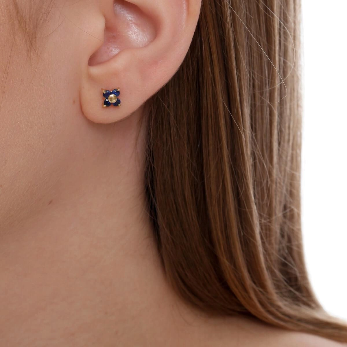 Brinco Ouro 18k Flor Azul 5.50mm. Delicado brinco em ouro com formato de flor de quatro pétalas, formada por pedrarias azuis. Sugere delicadeza e acrescenta delicado toque de cor. Ideal para presentes.