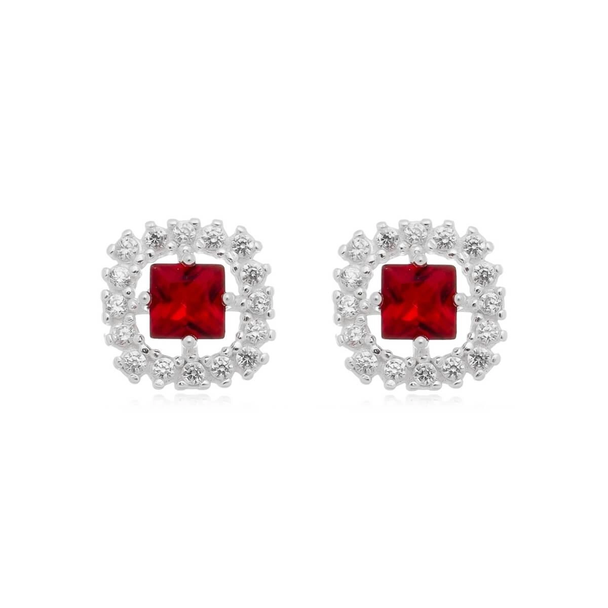 Brinco Prata Solitário Vermelho C/ Pedras Laterais 9mm Prata 925